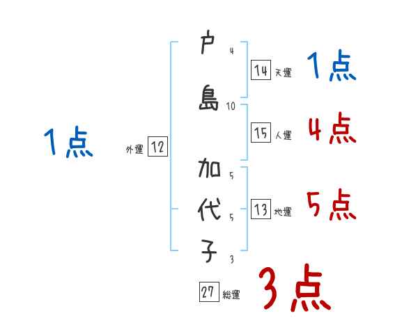 外運![]() | 戸島加代子さんの外運は12画の1つ星!簡単な失敗で諦めてしまいやすいかも。着実に行動すると良いでしょう。 生活面を象徴する運勢です。外部から受ける影響力を表し、結婚運、家庭運や職場、環境への順応性を表します。 |