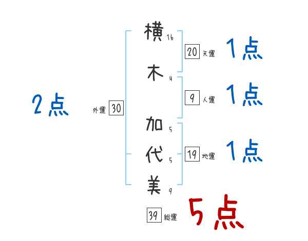 総運![]() | 横木加代美さんの総運は39画の5つ星!社交性に優れ人望が厚い。人の上に立ち成功する。 あなたの人生を表す1番重要な運勢です。生涯を通じて影響する総合運となり、主に50歳以降の晩年期に影響を及ぼします。 |