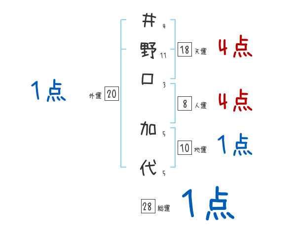 天運![]() | 井野口加代さんの天運は18画の4つ星!情熱的で剛気。忍耐力があり信頼される。 家系が持つ宿命的な運勢を表します。祖先から受け継いだ苗字ですので自分の力が及びません。家柄を象徴します。 |