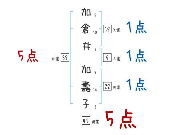 外運![]() | 加倉井加壽子さんの外運は32画の5つ星!柔軟性があり成功する。チャンスが多く金運が良い。 生活面を象徴する運勢です。外部から受ける影響力を表し、結婚運、家庭運や職場、環境への順応性を表します。 |