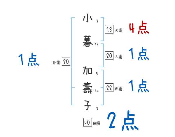 天運![]() | 小暮加壽子さんの天運は18画の4つ星!情熱的で剛気。忍耐力があり信頼される。 家系が持つ宿命的な運勢を表します。祖先から受け継いだ苗字ですので自分の力が及びません。家柄を象徴します。 |