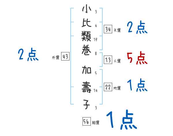人運![]() | 小比類巻加壽子さんの人運は13画の5つ星!才能に恵まれ人気がある。名声を手に入れる。円満な人生。 性格や才能などを表す2番目に重要な運勢です。人間関係や協調性、社会的な成功に影響します。主に20歳から50歳ぐらいまでの中年期の運勢を表します。 |