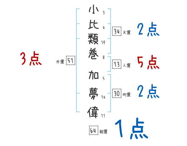 外運![]() | 小比類巻加夢偉さんの外運は51画の3つ星!変化が激しく、危険に注意。堅実な性格。 生活面を象徴する運勢です。外部から受ける影響力を表し、結婚運、家庭運や職場、環境への順応性を表します。 |