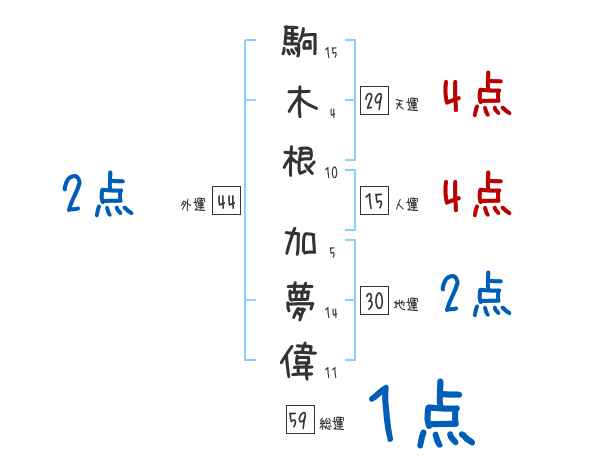 外運![]() | 駒木根加夢偉さんの外運は44画の2つ星!誠実で慎重な性格。物事を考えすぎないように注意しましょう。 生活面を象徴する運勢です。外部から受ける影響力を表し、結婚運、家庭運や職場、環境への順応性を表します。 |