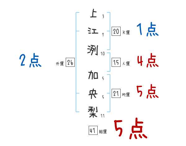 外運![]() | 上江洌加央梨さんの外運は26画の2つ星!波瀾万丈かも。信頼できる人を大事にしましょう。 生活面を象徴する運勢です。外部から受ける影響力を表し、結婚運、家庭運や職場、環境への順応性を表します。 |
