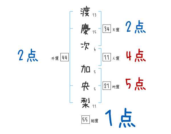 人運![]() | 渡慶次加央梨さんの人運は11画の4つ星!着実に富や地位を得る幸運な人生。 性格や才能などを表す2番目に重要な運勢です。人間関係や協調性、社会的な成功に影響します。主に20歳から50歳ぐらいまでの中年期の運勢を表します。 |