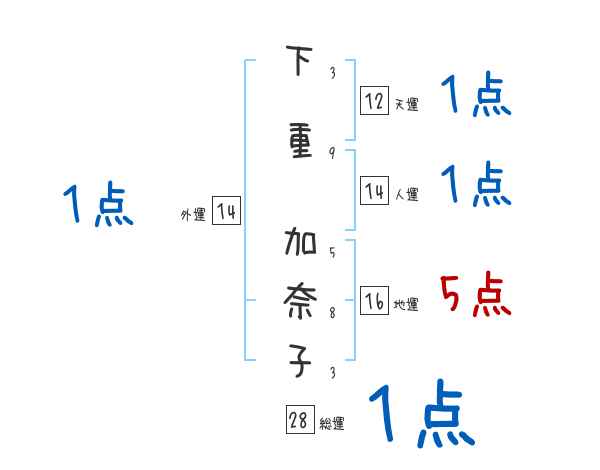 外運![]() | 下重加奈子さんの外運は14画の1つ星!人に対して優しいがストレスを溜め込みがち。人間関係のトラブルを避けるよう気をつけましょう。 生活面を象徴する運勢です。外部から受ける影響力を表し、結婚運、家庭運や職場、環境への順応性を表します。 |