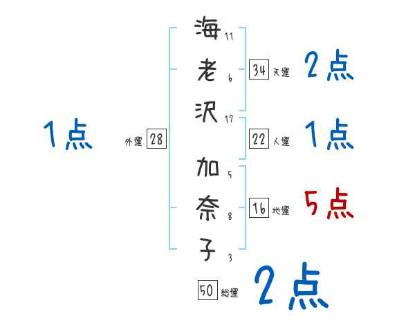 外運![]() | 海老沢加奈子さんの外運は28画の1つ星!家庭環境に注意。スポーツで活躍できる能力があるかも。 生活面を象徴する運勢です。外部から受ける影響力を表し、結婚運、家庭運や職場、環境への順応性を表します。 |