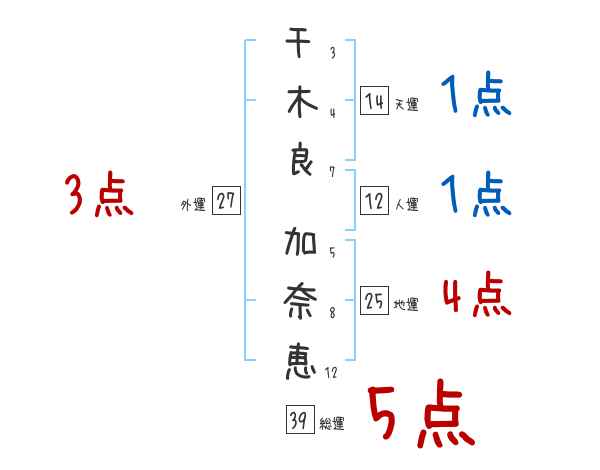 外運![]() | 千木良加奈恵さんの外運は27画の3つ星!頭脳明晰だが強情で摩擦が多い傾向。孤立に注意。 生活面を象徴する運勢です。外部から受ける影響力を表し、結婚運、家庭運や職場、環境への順応性を表します。 |