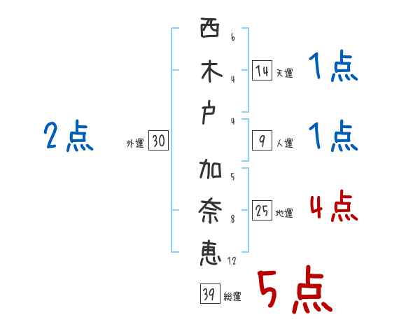 総運![]() | 西木戸加奈恵さんの総運は39画の5つ星!社交性に優れ人望が厚い。人の上に立ち成功する。 あなたの人生を表す1番重要な運勢です。生涯を通じて影響する総合運となり、主に50歳以降の晩年期に影響を及ぼします。 |