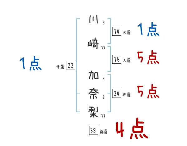 外運![]() | 川﨑加奈梨さんの外運は22画の1つ星!努力することが苦手ないっぽう手先が器用。芸術性にも優れる。 生活面を象徴する運勢です。外部から受ける影響力を表し、結婚運、家庭運や職場、環境への順応性を表します。 |
