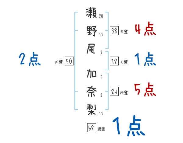 外運![]() | 瀬野尾加奈梨さんの外運は50画の2つ星!浮き沈みが激しく不安定。しりすぼみに衰退しやすいので注意しましょう。 生活面を象徴する運勢です。外部から受ける影響力を表し、結婚運、家庭運や職場、環境への順応性を表します。 |