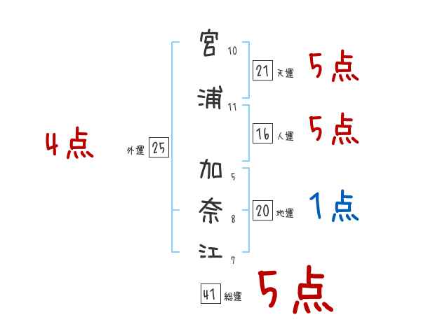 天運![]() | 宮浦加奈江さんの天運は21画の5つ星!統率力がある。独立し成功する。名誉を手に入れる。 家系が持つ宿命的な運勢を表します。祖先から受け継いだ苗字ですので自分の力が及びません。家柄を象徴します。 |