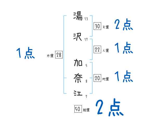 外運![]() | 湯沢加奈江さんの外運は28画の1つ星!家庭環境に注意。スポーツで活躍できる能力があるかも。 生活面を象徴する運勢です。外部から受ける影響力を表し、結婚運、家庭運や職場、環境への順応性を表します。 |