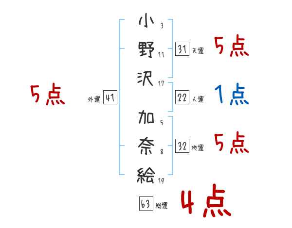 総運![]() | 小野沢加奈絵さんの総運は63画の4つ星!家庭運がよく順調な生活。温和な性格。 あなたの人生を表す1番重要な運勢です。生涯を通じて影響する総合運となり、主に50歳以降の晩年期に影響を及ぼします。 |