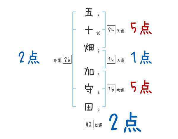 天運![]() | 五十畑加守田さんの天運は24画の5つ星!家庭運が良く順調な人生。金運にも恵まれる。 家系が持つ宿命的な運勢を表します。祖先から受け継いだ苗字ですので自分の力が及びません。家柄を象徴します。 |
