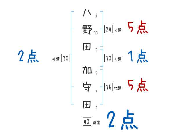 天運![]() | 八野田加守田さんの天運は24画の5つ星!家庭運が良く順調な人生。金運にも恵まれる。 家系が持つ宿命的な運勢を表します。祖先から受け継いだ苗字ですので自分の力が及びません。家柄を象徴します。 |