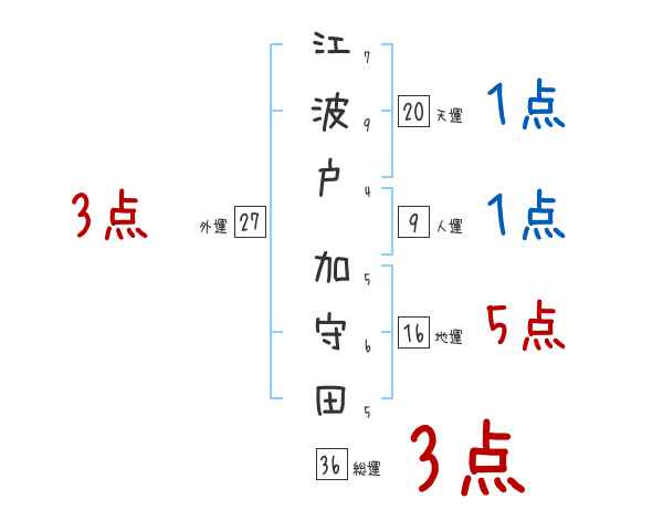 総運![]() | 江波戸加守田さんの総運は36画の3つ星!先見性が豊かです。多少神経質で苦労することも。 あなたの人生を表す1番重要な運勢です。生涯を通じて影響する総合運となり、主に50歳以降の晩年期に影響を及ぼします。 |