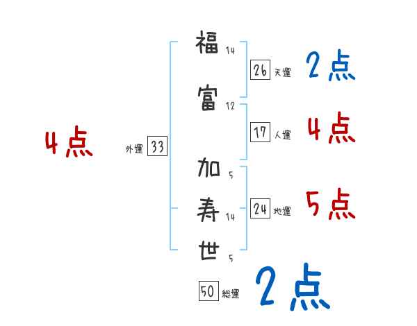 総運![]() | 福富加寿世さんの総運は50画の2つ星!浮き沈みが激しく不安定。しりすぼみに衰退しやすいので注意しましょう。 あなたの人生を表す1番重要な運勢です。生涯を通じて影響する総合運となり、主に50歳以降の晩年期に影響を及ぼします。 |