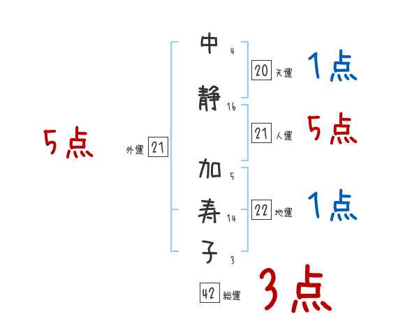 外運![]() | 中静加寿子さんの外運は21画の5つ星!統率力がある。独立し成功する。名誉を手に入れる。 生活面を象徴する運勢です。外部から受ける影響力を表し、結婚運、家庭運や職場、環境への順応性を表します。 |