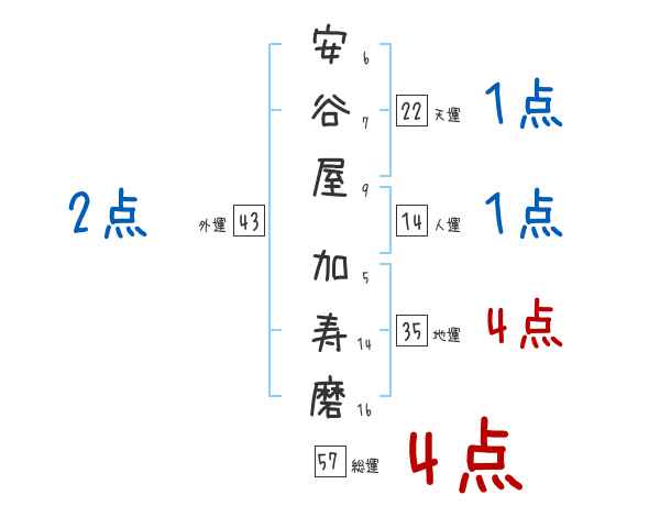 天運![]() | 安谷屋加寿磨さんの天運は22画の1つ星!努力することが苦手ないっぽう手先が器用。芸術性にも優れる。 家系が持つ宿命的な運勢を表します。祖先から受け継いだ苗字ですので自分の力が及びません。家柄を象徴します。 |