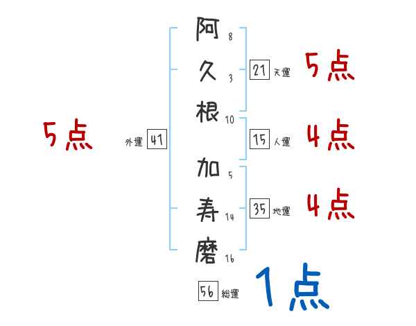 天運![]() | 阿久根加寿磨さんの天運は21画の5つ星!統率力がある。独立し成功する。名誉を手に入れる。 家系が持つ宿命的な運勢を表します。祖先から受け継いだ苗字ですので自分の力が及びません。家柄を象徴します。 |