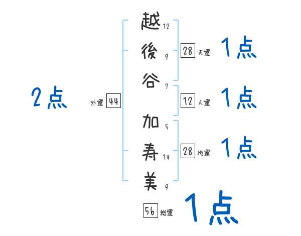 天運![]() | 越後谷加寿美さんの天運は28画の1つ星!家庭環境に注意。スポーツで活躍できる能力があるかも。 家系が持つ宿命的な運勢を表します。祖先から受け継いだ苗字ですので自分の力が及びません。家柄を象徴します。 |