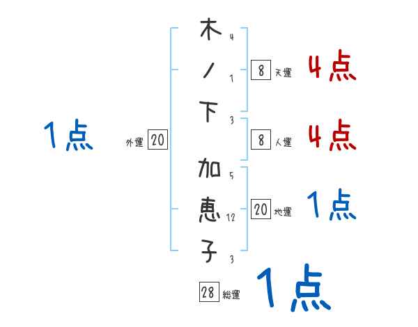総運![]() | 木ノ下加恵子さんの総運は28画の1つ星!家庭環境に注意。スポーツで活躍できる能力があるかも。 あなたの人生を表す1番重要な運勢です。生涯を通じて影響する総合運となり、主に50歳以降の晩年期に影響を及ぼします。 |