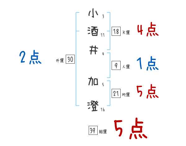 総運![]() | 小酒井加澄さんの総運は39画の5つ星!社交性に優れ人望が厚い。人の上に立ち成功する。 あなたの人生を表す1番重要な運勢です。生涯を通じて影響する総合運となり、主に50歳以降の晩年期に影響を及ぼします。 |