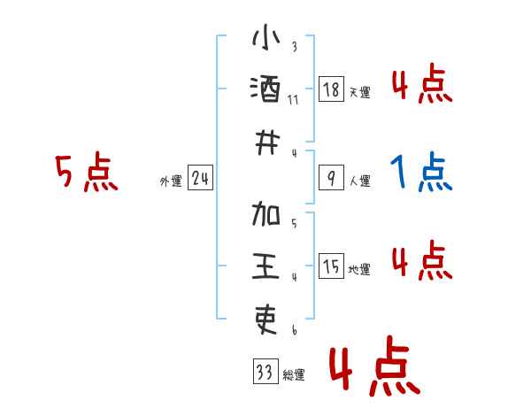 総運![]() | 小酒井加王吏さんの総運は33画の4つ星!権力志向でプライドが高い。勇気があり運を切り開き成功する。 あなたの人生を表す1番重要な運勢です。生涯を通じて影響する総合運となり、主に50歳以降の晩年期に影響を及ぼします。 |