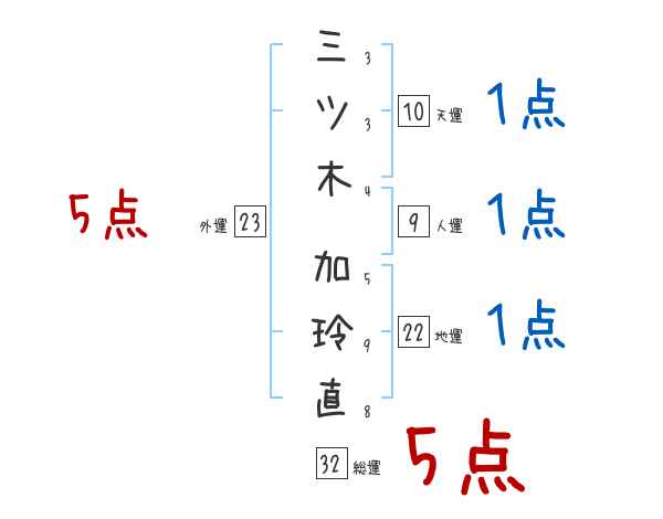 総運![]() | 三ツ木加玲直さんの総運は32画の5つ星!柔軟性があり成功する。チャンスが多く金運が良い。 あなたの人生を表す1番重要な運勢です。生涯を通じて影響する総合運となり、主に50歳以降の晩年期に影響を及ぼします。 |