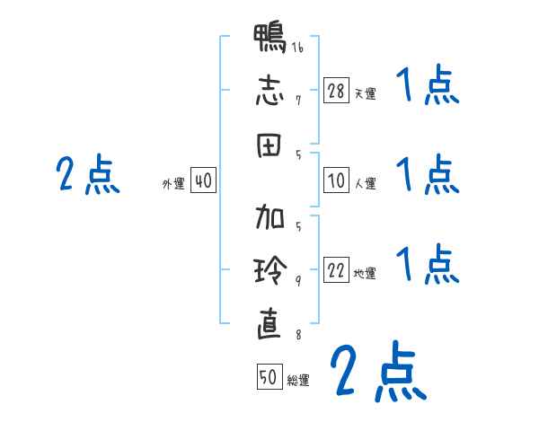 総運![]() | 鴨志田加玲直さんの総運は50画の2つ星!浮き沈みが激しく不安定。しりすぼみに衰退しやすいので注意しましょう。 あなたの人生を表す1番重要な運勢です。生涯を通じて影響する総合運となり、主に50歳以降の晩年期に影響を及ぼします。 |