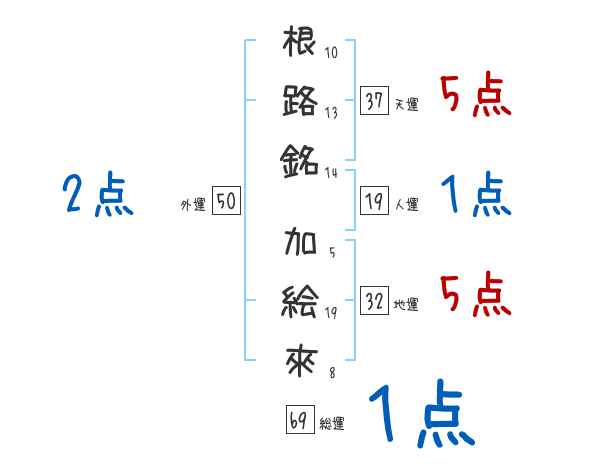 外運![]() | 根路銘加絵來さんの外運は50画の2つ星!浮き沈みが激しく不安定。しりすぼみに衰退しやすいので注意しましょう。 生活面を象徴する運勢です。外部から受ける影響力を表し、結婚運、家庭運や職場、環境への順応性を表します。 |