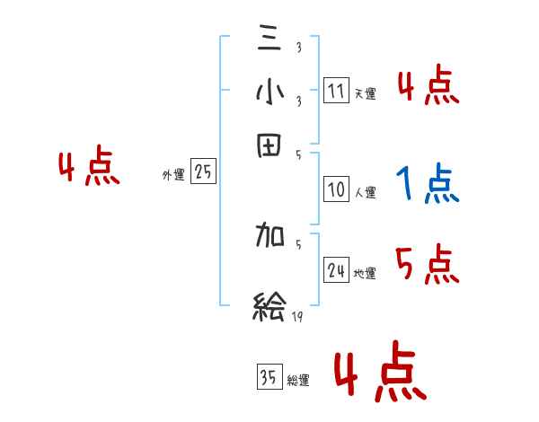 天運![]() | 三小田加絵さんの天運は11画の4つ星!着実に富や地位を得る幸運な人生。 家系が持つ宿命的な運勢を表します。祖先から受け継いだ苗字ですので自分の力が及びません。家柄を象徴します。 |