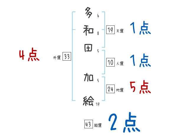 外運![]() | 多和田加絵さんの外運は33画の4つ星!権力志向でプライドが高い。勇気があり運を切り開き成功する。 生活面を象徴する運勢です。外部から受ける影響力を表し、結婚運、家庭運や職場、環境への順応性を表します。 |