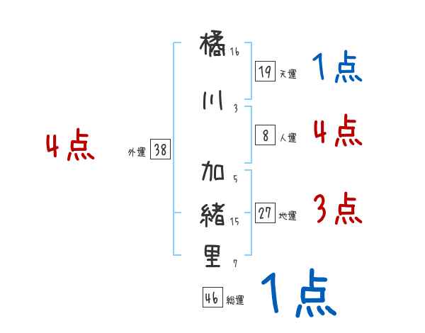 外運![]() | 橘川加緒里さんの外運は38画の4つ星!温厚な性格で技術的な才能を発揮する。職人的な仕事に向いている。 生活面を象徴する運勢です。外部から受ける影響力を表し、結婚運、家庭運や職場、環境への順応性を表します。 |