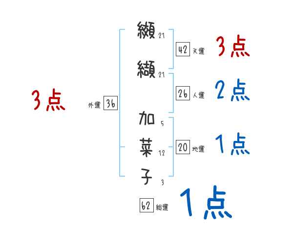 外運![]() | 纐纈加菜子さんの外運は36画の3つ星!先見性が豊かです。多少神経質で苦労することも。 生活面を象徴する運勢です。外部から受ける影響力を表し、結婚運、家庭運や職場、環境への順応性を表します。 |