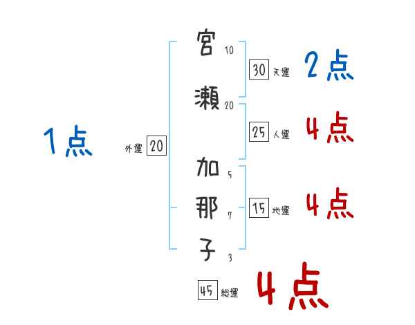 天運![]() | 宮瀬加那子さんの天運は30画の2つ星!浮き沈みの激しさに注意しましょう。 家系が持つ宿命的な運勢を表します。祖先から受け継いだ苗字ですので自分の力が及びません。家柄を象徴します。 |
