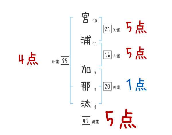 天運![]() | 宮浦加那汰さんの天運は21画の5つ星!統率力がある。独立し成功する。名誉を手に入れる。 家系が持つ宿命的な運勢を表します。祖先から受け継いだ苗字ですので自分の力が及びません。家柄を象徴します。 |