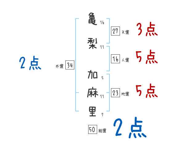 天運![]() | 亀梨加麻里さんの天運は27画の3つ星!頭脳明晰だが強情で摩擦が多い傾向。孤立に注意。 家系が持つ宿命的な運勢を表します。祖先から受け継いだ苗字ですので自分の力が及びません。家柄を象徴します。 |