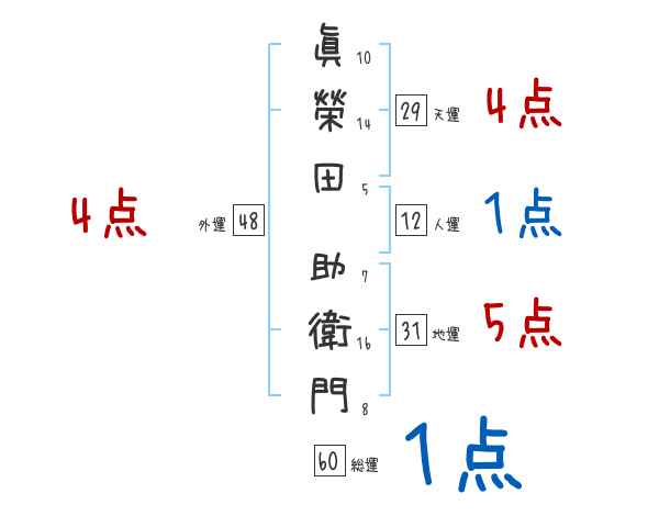 天運![]() | 眞榮田助衛門さんの天運は29画の4つ星!完全主義で才能がある。厳格な心の持ち主。 家系が持つ宿命的な運勢を表します。祖先から受け継いだ苗字ですので自分の力が及びません。家柄を象徴します。 |