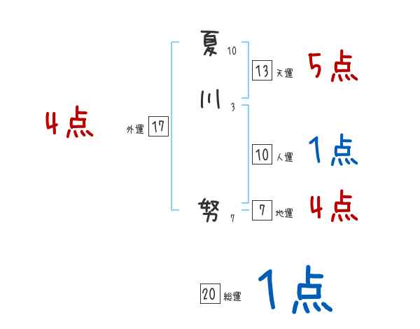 地運![]() | 夏川努さんの地運は7画の4つ星!強い意志や信念を持ち独立心が強い。自立する。 個性を表す基礎的な運勢です。性格形成や対人関係、行動力など家庭環境に影響されます。主に誕生してから20歳くらいまでの若年期の運勢を表します。 |