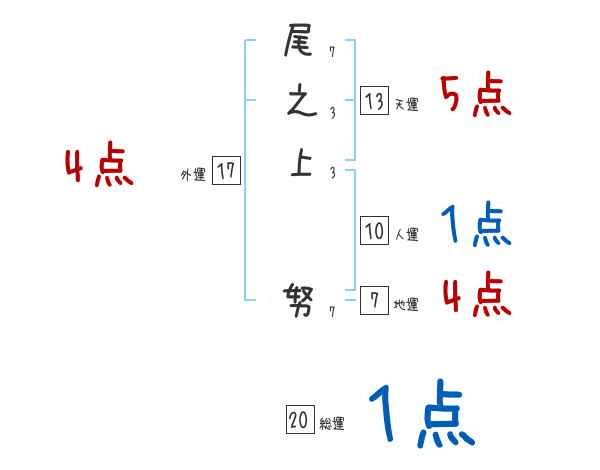 外運![]() | 尾之上努さんの外運は17画の4つ星!積極的な行動力。地位を気づき財産を手に入れる。純粋な心と直感力。 生活面を象徴する運勢です。外部から受ける影響力を表し、結婚運、家庭運や職場、環境への順応性を表します。 |