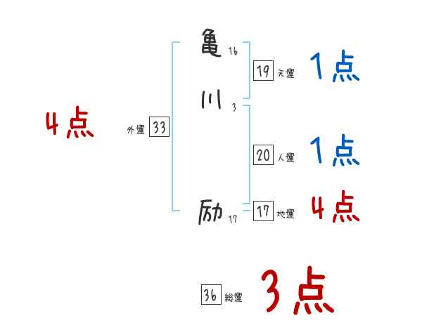 天運![]() | 亀川励さんの天運は19画の1つ星!優れた才能を持ちますが、協調性が足りないことも。周りの人と協力する事を意識しましょう。 家系が持つ宿命的な運勢を表します。祖先から受け継いだ苗字ですので自分の力が及びません。家柄を象徴します。 |