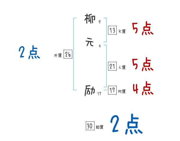 外運![]() | 柳元励さんの外運は26画の2つ星!波瀾万丈かも。信頼できる人を大事にしましょう。 生活面を象徴する運勢です。外部から受ける影響力を表し、結婚運、家庭運や職場、環境への順応性を表します。 |