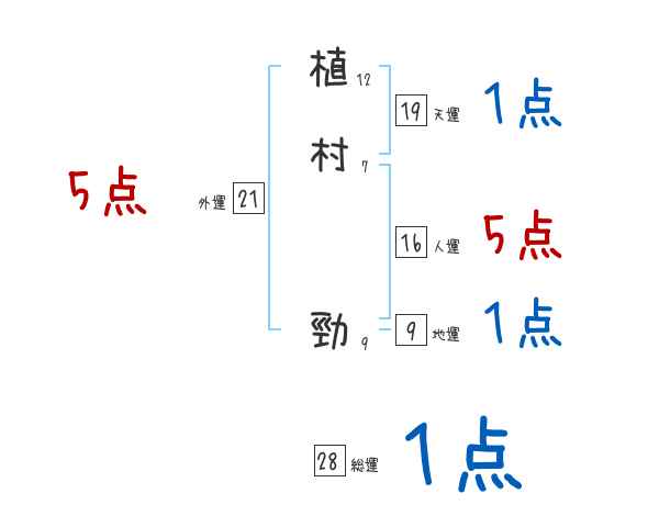 人運![]() | 植村勁さんの人運は16画の5つ星!人望が厚く大きく発展する。逆転成功が見える。 性格や才能などを表す2番目に重要な運勢です。人間関係や協調性、社会的な成功に影響します。主に20歳から50歳ぐらいまでの中年期の運勢を表します。 |