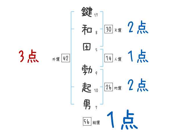 天運![]() | 鍵和田勃起男さんの天運は30画の2つ星!浮き沈みの激しさに注意しましょう。 家系が持つ宿命的な運勢を表します。祖先から受け継いだ苗字ですので自分の力が及びません。家柄を象徴します。 |