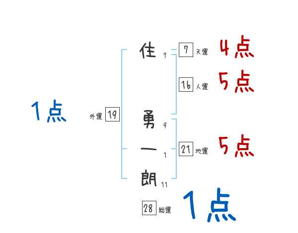 天運![]() | 住勇一朗さんの天運は7画の4つ星!強い意志や信念を持ち独立心が強い。自立する。 家系が持つ宿命的な運勢を表します。祖先から受け継いだ苗字ですので自分の力が及びません。家柄を象徴します。 |