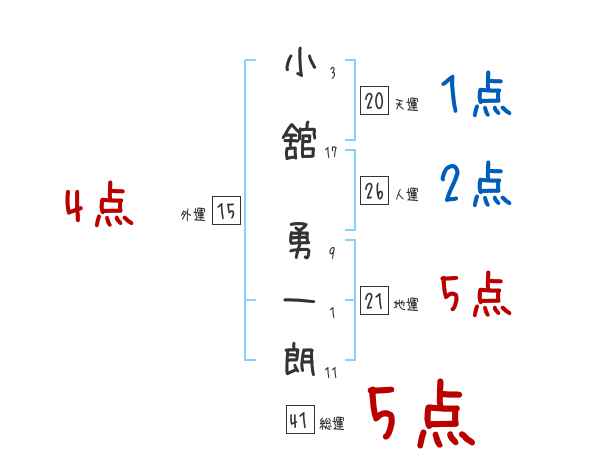 外運![]() | 小舘勇一朗さんの外運は15画の4つ星!人徳があり出世する。順調に物事を進め円満な人生。 生活面を象徴する運勢です。外部から受ける影響力を表し、結婚運、家庭運や職場、環境への順応性を表します。 |