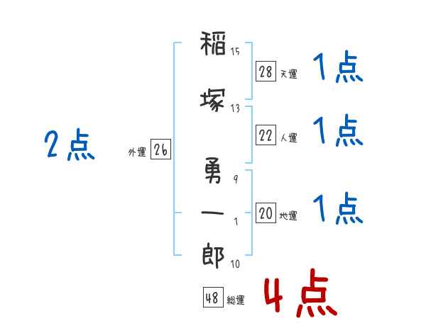 天運![]() | 稲塚勇一郎さんの天運は28画の1つ星!家庭環境に注意。スポーツで活躍できる能力があるかも。 家系が持つ宿命的な運勢を表します。祖先から受け継いだ苗字ですので自分の力が及びません。家柄を象徴します。 |